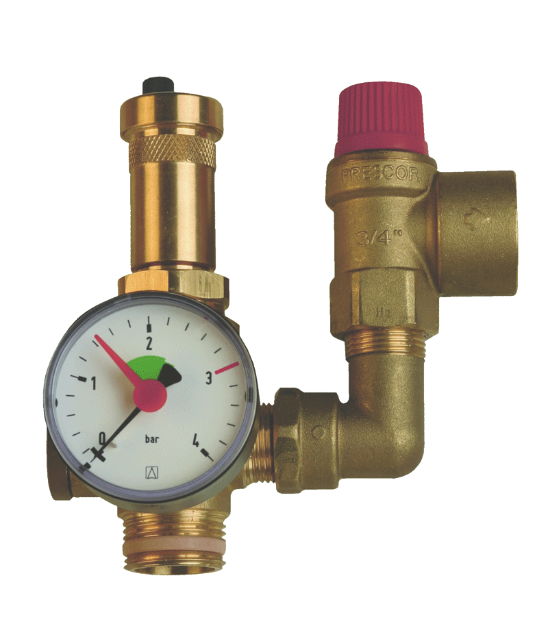 Группа безопасности для бойлера. Предназначена для закрытых отопительных систем. Оборудована предохранительным клапаном (10 бар), стопорным клапаном.